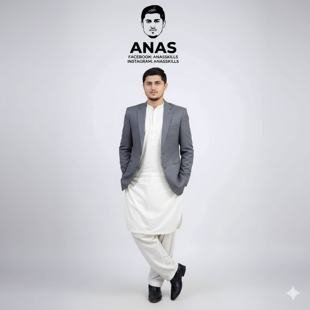 a stylish portrait of a man standing casually against a plain light grey background he is wearing a traditional white shalwar kameez with grey formal blazer on top paired with black formal shoes the manman has his hands in his pockets one leg crossed over the other and is looking slightly to the side above him on the wall there is a bold black and white vector illustration of his face along with his nme written in bold text name below the name add social media handles face book @ Anas skills the overall style is clean modren and professional with a minimal studio look