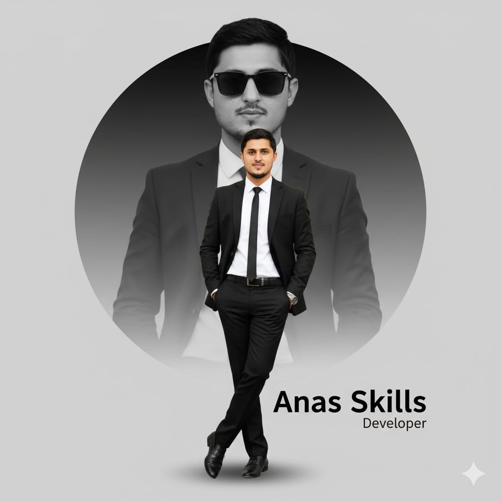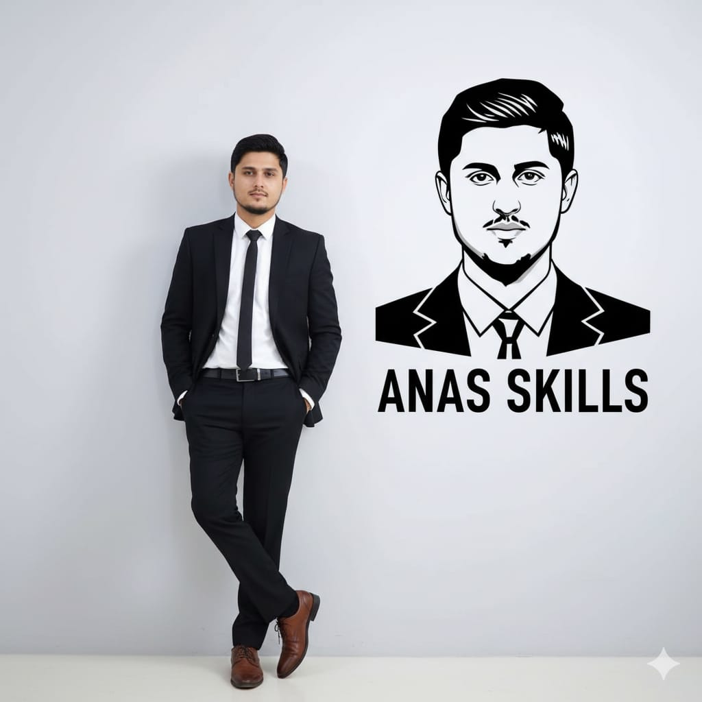 Photo-realistic 8K full-body portraitof this man, I’m the above image leaning casually against a clean light-grey wall. He is wearing a professional Black suit, socks, and Brown Shoes. Hands in pockets, one leg crossed over the other, relaxed, confident pose. On the wall next to him, create a bold black-and-white stylized vector portrait of the same man with modern geometric elements.Below the graphic, add clean bold text: ‘ Anas Skills’ in Capital letter. bright and clean professional lighting studio quality. Mood: modern, minimalistic, premium personal branding aesthetic.