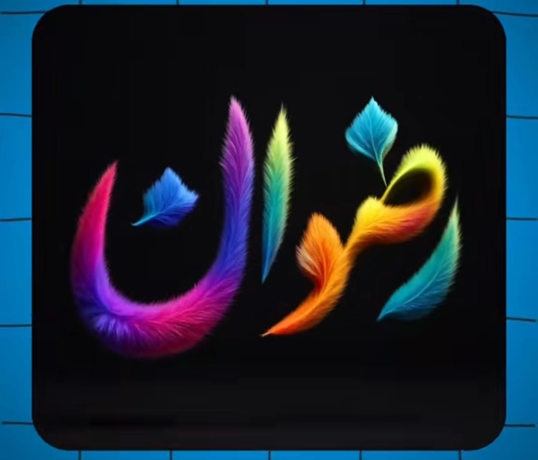A stylized Arabic calligraphy spelling the word ‘خان made of soft, fluffy fur-like textures in vibrant rainbow colors. Each letter is uniquely colored, blending gradients of red, blue, yellow, pink, purple, green, and orange. The background is deep black to highlight the vividness of the colors. Feathers of matching colors float gently around the text, enhancing the softness and elegance. The overall style is whimsical and magical, with a modern digital art aesthetic